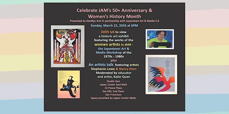 Join us to view a historic art exhibit featuring the works of women artists in JAM - the Japan Art and Media Workshop of the 1970s - 1980s plus an artists talk featuring artists Stephanie Lowe and Nancy Hom, moderated by educator and artist Katie Quan.
